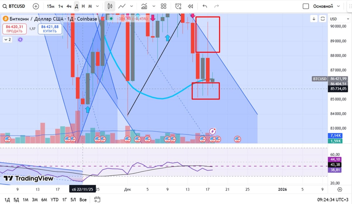 Зоны интереса. Видно, что цена колеблется около консенсуса, но у продавцов давление сильнее. Отсюда простой вывод - пробой среднего приведет к немедленному проливу, что-то мне подсказывает, что плитка внизу тонкая. #BTC