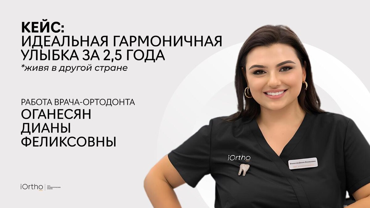Функциональных жалоб не было, но ощущение дискомфорта и неуверенности — да. После диагностики стало понятно, что за эстетикой скрываются более глубокие задачи: — скученность зубов, — прикус II класса, — ротация премоляров. Лечение вела Оганесян Диана Феликсовна, врач-ортодонт клиники iOrtho. Особенность случая Пациентка на протяжении лечения проживала в другой стране, поэтому часть приёмов проходила дистанционно. Благодаря системе Invisalign, цифровому планированию и чёткому контролю этапов это позволило сохранить точность и прогнозируемость лечения без потери качества. Перед стартом мы провели полную диагностику, создали 3D-модель будущей улыбки и согласовали поэтапный план лечения. Далее — регулярные онлайн-контроли, плановые визиты в клинику и высокая дисциплина со стороны пациентки. Сроки и система Лечение длилось 2,5 года и проводилось на системе Invisalign — оптимальный вариант для сложных случаев с возможностью дистанционного сопровождения. Результат — ровные зубы без ск