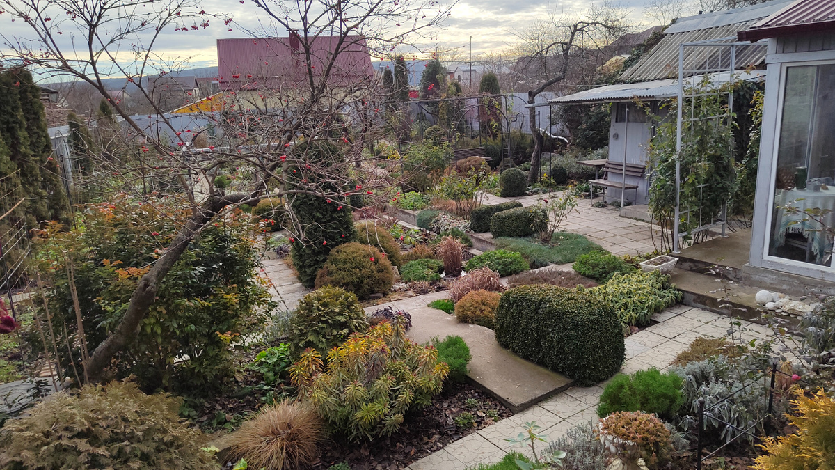 17.12.2025 г. Пятигорск. У нас после похолодания, ветра и небольшого снега, опять потеплело до +6 С днём. И я снова приглашаю вас на очередную прогулку по моему саду. Пока деревья без листьев, я решила показать вам свой сад с высоты. Я встала за забором на табурет и начала снимать, вот такой вид открылся взору. Вдали, где дом соседей у нас юг. Справа наш чайный домик. Он небольшой всего 9 кв. метров (3м х3м). И расположен он на западе нашего участка, вернее на северо-западе. Забор, что виднеется на фото ниже, как раз и закрывает участок с севера. Здесь видно, что задняя стена дома - это часть забора. Обратите внимание на крыши домов, далеко на юге дом соседа, он первый сделал крышу такого пурпурно-сливового цвета. Цвет мне этот понравился и я сделала свою крышу у чайного домика такого же цвета. А потом начал строиться сосед, что расположен слева за забором, там, где у нас восток. Он спросил у меня, какого цвета делать ему крышу? Я ответила, что такую же как у нас. Так и получилось, что