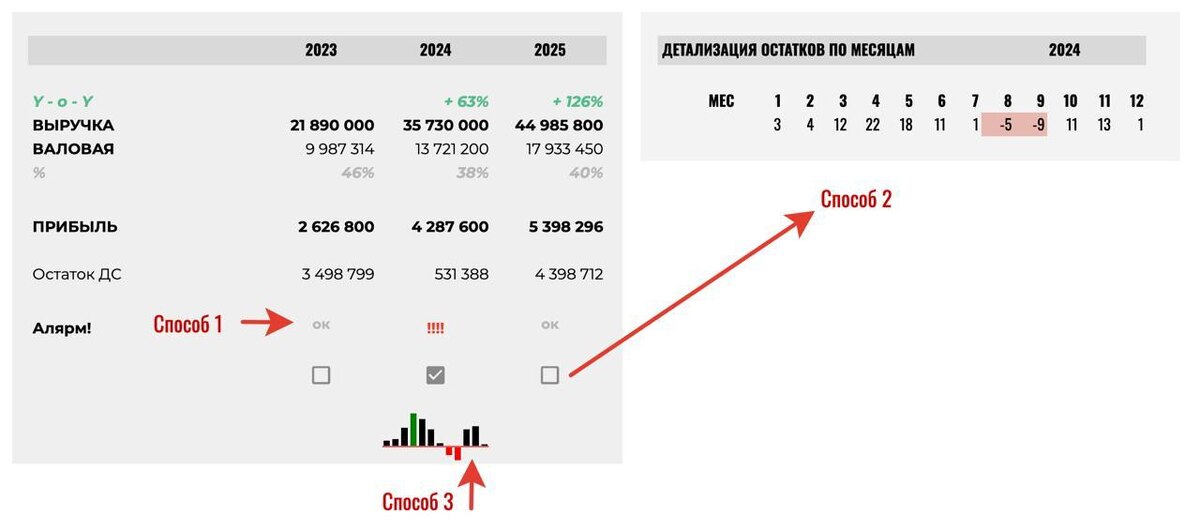 ? Детализировать! Это что-то типа drill-down метода или скользящего walkthrough на аналитическом дашборде. Вот 3 способа, как это можно делать в модели или в рамках учета ✨ Берите на заметку! 1️⃣ Первый способ — алерт. Это когда мы не даем фактуру, а просто выставляем по технике светофора (про нее читайте в этом посте), выделяем то, на что стоит обратить внимание. 🚦 Светофор/алерт не дает деталей и фактуры, но так мы подсвечиваем область, куда надо провалиться и погрузиться. В нашем случае — второй год, и алерт говорит о том, что надо посмотреть не по году, а помесячно в дополнительной детализации. Используем красный восклицательный знак, условное форматирование, флаг — что угодно, что привлечет внимание собственника. 2️⃣ Второй способ — чекбокс. Работаем вкупе с алертом, но чекбокс сразу «подтягивает» на дашборд детализацию. Ты тыкаешь куда нужно — и в отдельной области тебе дается развертка/детализация по фильтру, которая раскрывает, где проблема. В моем примере это дета