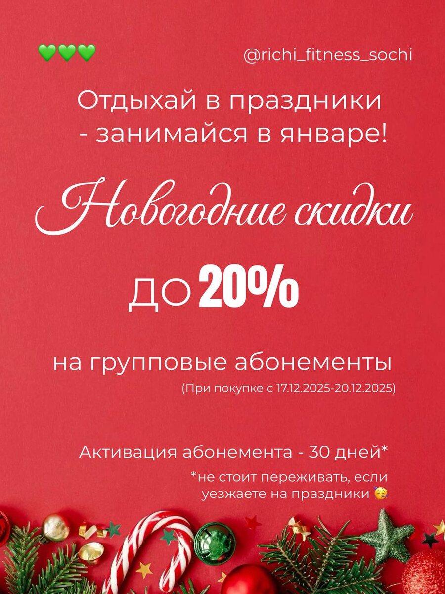 Новогодние скидки до 20% 🎄 на групповые абонементы с 17 по 20 декабря 🥳 Абонемент активируется через 30 дней — без спешки и тревог, даже если вы уезжаете на праздники 🙌🏻 Возвращайтесь в январе — в ресурсном теле, спокойной голове и с новыми целями. Richi Fitness Club Движение с заботой о себе 💚