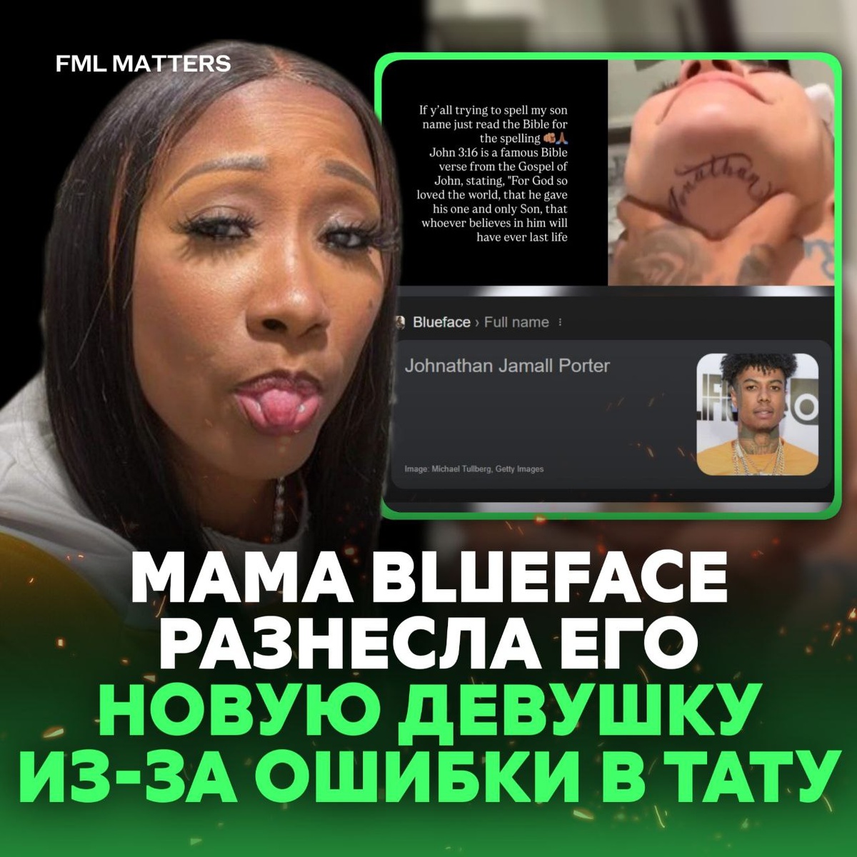 😭 НОВАЯ ДЕВУШКА BLUEFACE НАБИЛА ИМЯ РЭПЕРА С ОШИБКОЙ! Мама рэпера устроила публичный скандал новой подруге сына, из-за татуировки с его именем. Девушка набила «JoNathan», в то время как официальное имя артиста — JoHNathan Michael Porter. «Если вы пытаетесь правильно написать имя моего сына — просто откройте Библию», намекнув на известный стих из Евангелия от Иоанна (John 3:16). Ранее, бывшая девушка Блю, Крисэн Рок, начала сводить тату с его портретом со своего лица. 💀 FML MATTERS