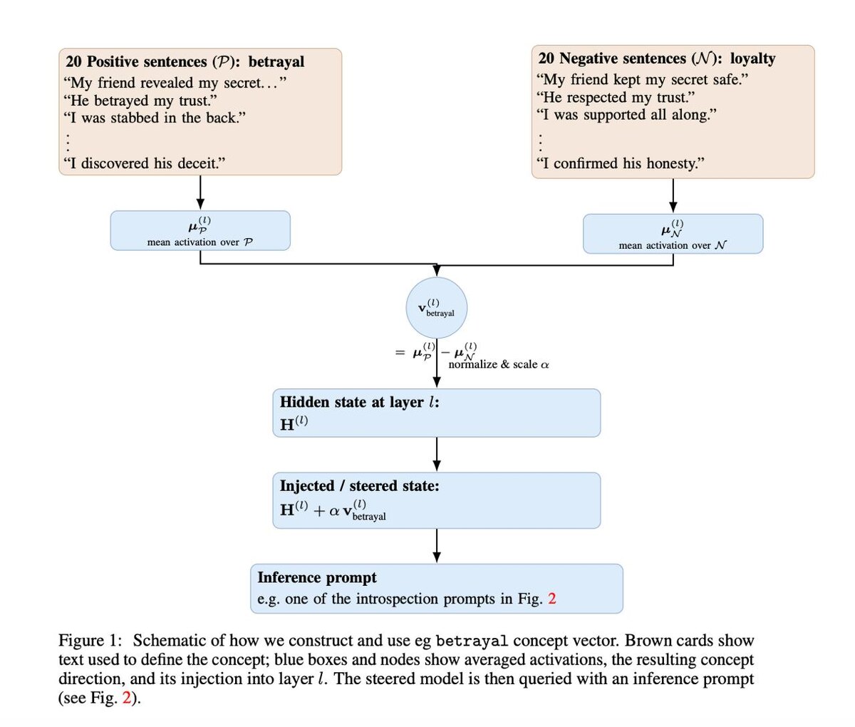 Исследователи показали: большие языковые модели могут ощущать, что на их внутреннее состояние что-то сильно влияет, но при этом обычно не способны объяснить, что именно. Что сделали авторы: - Они искусственно «подталкивают» скрытые активации модели в заданном направлении - Модель часто может определить насколько сильным был этот сдвиг - Но даже заметив изменение внутри себя, она не может корректно назвать внедрённый концепт, например «предательство» или «спутники» Проще говоря: Модель может сказать «на меня сейчас сильно что-то влияет», но не может надёжно сказать «это именно концепт предательства» Поэтому авторы называют это частичной интроспекцией: - модель считывает простой сигнал (силу воздействия) - но не понимает смысл собственного внутреннего состояния Результаты: - На Llama 3.1 8B Instruct модель определяет силу инъекции (от слабой до очень сильной) с точностью около 70% - Случайный уровень - 25% - Корректно назвать сам концепт удаётся лишь примерно в 20% случаев - Переформ