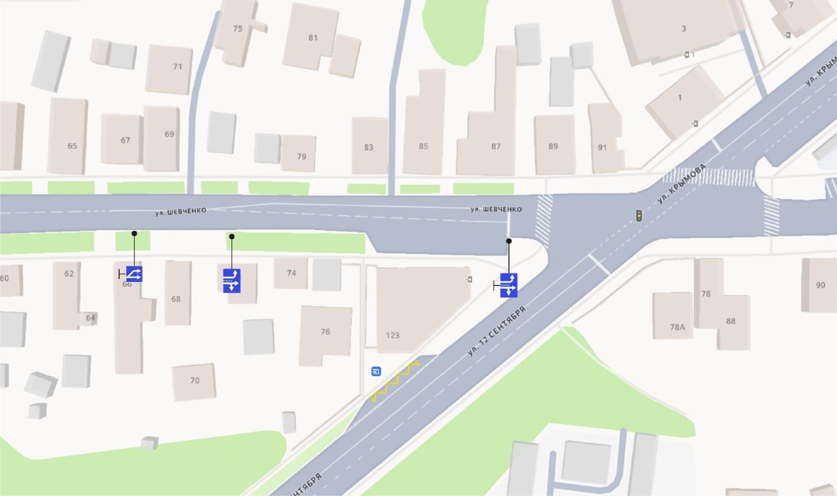 На пересечении улицы Шевченко с улицами Крымова и 12 Сентября появились новые дорожные знаки 5.15.1 "Движение по полосам