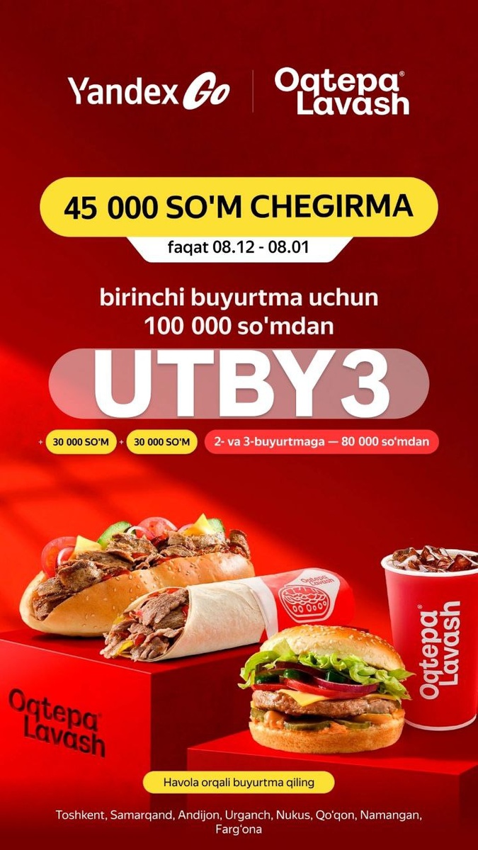 ! 🌧🌨 Derazadan tashqarida sovuq va noqulay ob-havo hukmronlik qilayotganida, sizni faqat bitta narsa qutqara oladi – bu Yandex Go Eda orqali yetib keladigan issiq va mazali taom! 😋 Yandex Go ilovasi orqali sevimli restoranlaringizni tanlang va vaqtingizni haqiqiy iliqlikda, uyingizda o'tkazing. Unutmang, Yandex Eda Promokodi bilan har doim tejamkorlik qilish mumkin! Birinchi uchta buyurtmangizga maxsus Promokod Yandex Eda ishlating: 🔥UTBY3🔥 – 80 000 so'mdan boshlangan buyurtmalar uchun 90 000 so'm chegirma (har biri 30 000 so'mdan). Bu chegirma Yandex Go ilovasining “Taomlar” bo'limida amal qiladi. Bu Promokod Yandex Go Eda bilan siz yanada ko'proq tejamkorlik qilasiz! 🔗 Ilovani yuklab oling va qulay sharoitda buyurtma qiling! 👉🏻 https://go-yandex.prfl.me/promokodmarkazi/17kb16 📍 Bu aksiya boshqa aksiyalar bilan qo'shiladi va Toshkent, Andijon, Buxoro, Qarshi, Qo‘qon, Namangan, Nukus, Samarqand, Urganch va Farg‘ona shaharlarida ishlaydi. Eng yangi Yandex Eda Promokodlar