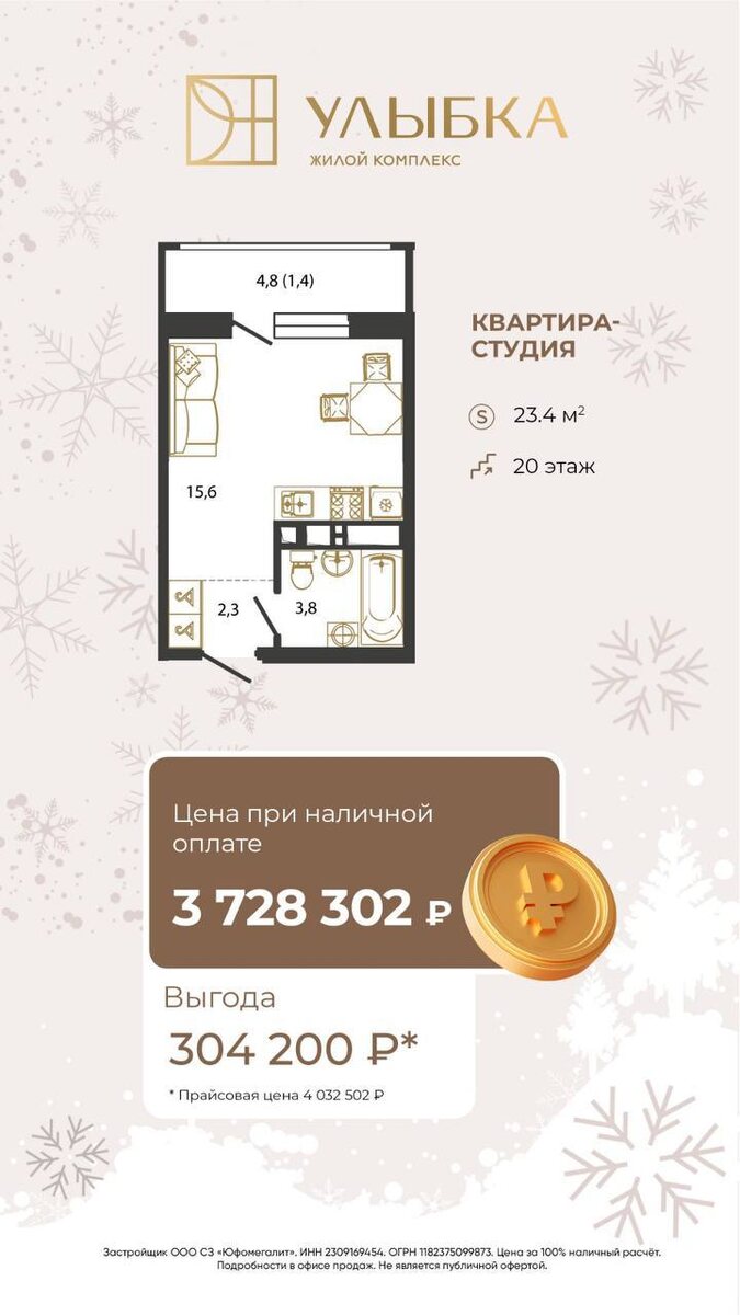 Ищете умное решение для инвестиций или уютное первое жильё? Прямо сейчас в полностью сданном доме в Краснодаре доступны студии по минимальной цене. Это шанс сделать себе или близким самый практичный подарок к Новому году — собственную квартиру! 🏙️ 💢 СТУДИИ ПО МИНИМАЛЬНОЙ ЦЕНЕ В СДАННОМ ДОМЕ Представляем специальную подборку в ЖК «Улыбка» — дом уже сдан, можно сразу оформлять собственность и заезжать! Преимущества ЖК «Улыбка»: • Полностью сданный дом с готовой отделкой • Развитая инфраструктура района вокруг • Удобная транспортная доступность • Благоустроенная дворовая территория ✨ ЛОТЫ ДНЯ | ЖК «УЛЫБКА» ➡️ Студия 23,4 м², 20 этаж Цена: 3 728 302 ₽ Ваша выгода: 304 200 ₽ 🔥 ➡️ Студия 25,9 м², 4 этаж Цена: 3 966 051 ₽ Ваша выгода: 336 700 ₽ 🔥 ➡️ Студия 24,6 м², 17 этаж Цена: 3 887 446 ₽ Ваша выгода: 319 800 ₽ 🔥 ➡️ Студия 25 м², 10 этаж Цена: 3 978 200 ₽ Ваша выгода: 325 000 ₽ 🔥 Идеальное предложение для тех, кто ценит выгоду, готовность дома и отличную локацию. Не упустите