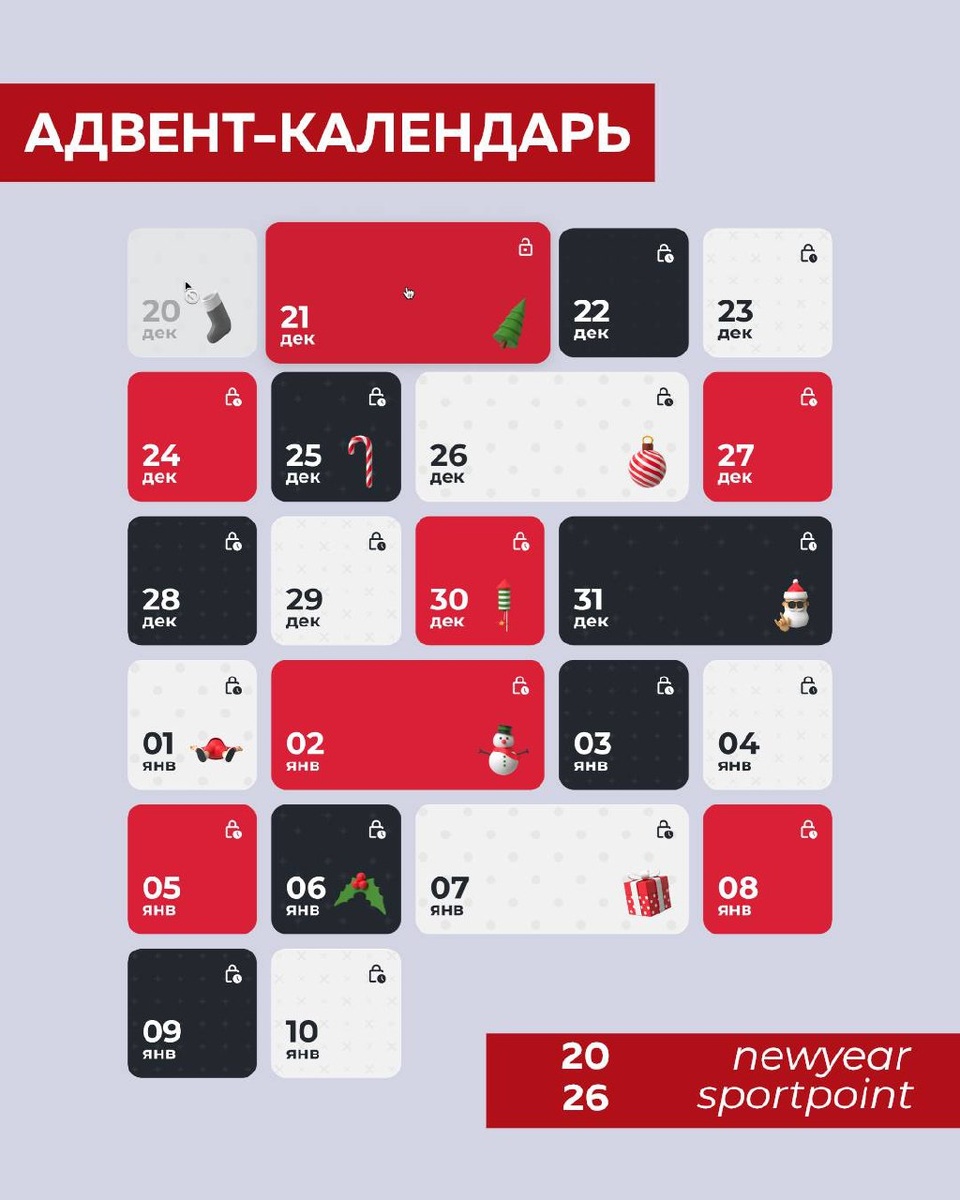 📆 С 18 по 31 декабря в SPORT POINT — адвент-календарь со специальными предложениями по датам. Каждый день — уникальный. Каждое предложение — ограниченное. Подписывайтесь и успевайте забрать своё🎁
