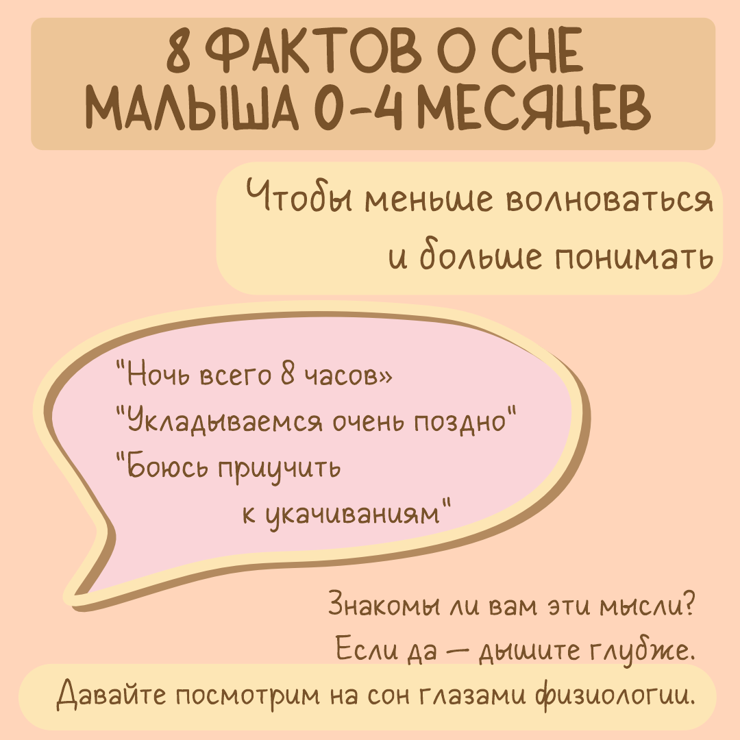 1️⃣ Короткая ночь - это норма! 💬"Ночные сны 8–9.5 часов в среднем. Независимо от того, во сколько уложила - это мало?" Реальность: ➡️ У новорождённых дневной и ночной сон часто равны по длине. Ночь в 8-10 часов с пробуждениями на еду - идеальная норма. В 0-3 месяца общий сон - 14-17 часов. Ночью - 8-10 ч, днём - 4-6 снов. Получается малыш в 2 месяца, засыпающий в 22:30, встающий в 7:00 и спящий днём 6 раз - абсолютно в норме! 2️⃣ Позднее укладывание до 4 мес - не преступление 💬"Спит ночью с 23:30–8–9 утра, днем сны… Не понимаю, это нормально или нет?" Реальность: ➡️ Циркадные ритмы ещё не установились. Уложите в 21:00 или в 23:00 - ночь всё равно будет те же 8-10 часов. Это физиологично. 🚩Учитывайте свой режим: если комфортно вставать в 5-6 утра - можете укладывать в 20-21 час, если хотите подъём ближе к 7-8 -можно позже. 3️⃣"Приучить к рукам" сейчас - невозможно 💬"Нам месяц и засыпаем только на руках, потом перекладываю в кроватку… Неужели всё, привык к рукам?" ➡️ Реальность: В пе
