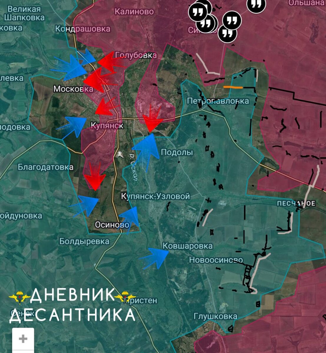 В городе и на его окраинах идут локальные бои. ВСУ не оставляют попыток прорыва и закрепления в городе. ▫️ В районе Кондрашовки, Московки, Радьковки частично серая зона. ▫️ ВСУ продолжают переброску войск в районы Ковшаровки и Купянск-Узлового. По радиоперехватам это наемники из южной Америки, в основном колумбийцы и зэки. Потери у противника большие. Причем этом в тг-каналах противника публикуется: Что ВСУ взяли 90% территории Купянска. Мы заявляем, что город наш. Рассписывать какие улицы за кем сейчас бред, потому что идут боевые действия, ситуация меняется постоянно, хохлы гонят всех и вся. Легко там точно не будет еще долго. Киевская хунта дала приказ держаться за каждый метр, не дают приказы на отступление, организовывают контратаки. 🚀 ФПВ дроны ВС РФ работают дальше и вычисляют группы ВСУ, которые пытаются вернуться в Купянск. ВСУ накопили силы у Купянска, а также Ковшаровки и Купянск Узлового, примерная численность вражеской группировки до 4 000 боевиков (иностранные наемни