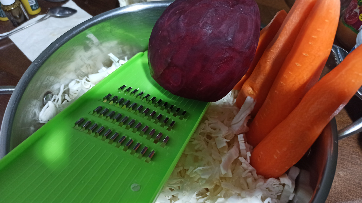 Морковь и свёклу натираю на корейской терке, лук шинкую тонко полукольцами. Капусту шинкую тонко.