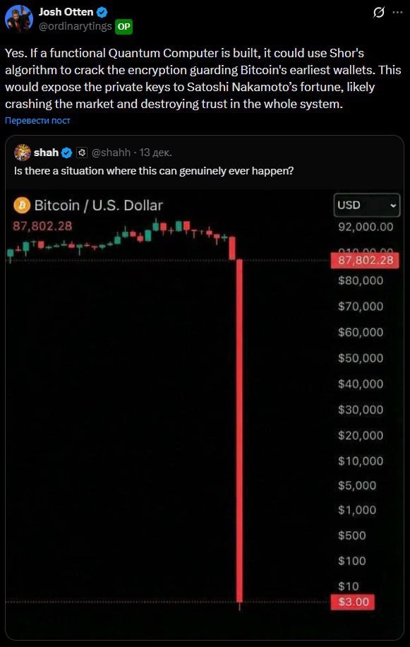 Π X ΡΠ΅ΠΉΡΠ°Ρ ΠΎΠ±ΡΡΠΆΠ΄Π°ΡΡ, ΡΡΠΎ Π±ΡΠ΄Π΅Ρ Ρ Π±ΠΈΡΠΊΠΎΠΈΠ½ΠΎΠΌ, Π΅ΡΠ»ΠΈ ΠΊΠ²Π°Π½ΡΠΎΠ²ΡΠΉ ΠΊΠΎΠΌΠΏΡΡΡΠ΅Ρ ΡΠΌΠΎΠΆΠ΅Ρ Π²Π·Π»ΠΎΠΌΠ°ΡΡ ΠΊΠΎΡΠ΅Π»ΡΠΊΠΈ Π‘Π°ΡΠΎΡΠΈ ΠΠ°ΠΊΠ°ΠΌΠΎΡΠΎ. ΠΠ½ΠΎΠ³ΠΈΠ΅ ΡΠ²Π»ΡΡΡΡΡ ΡΡΠΎΡΠΎΠ½Π½ΠΈΠΊΠ°ΠΌΠΈ ΡΠ΅Π·ΠΊΠΎΠ³ΠΎ ΠΎΠ±Π²Π°Π»Π° ΠΈ ΡΡΡΡ Π»ΠΈ Π½Π΅ ΠΎΠ±Π½ΡΠ»Π΅Π½ΠΈΡ ΡΠ΅Π½Ρ Π±ΠΈΡΠΊΠΎΠΈΠ½Π°. ΠΠ΄Π½Π°ΠΊΠΎ Willy Woo ΡΡΠΈΡΠ°Π΅Ρ, ΡΡΠΎ ΠΊΠΈΡΡ Π²ΠΎΡΠΏΠΎΠ»ΡΠ·ΡΡΡΡΡ ΡΡΠΈΠΌ ΠΈ Π±ΡΡΡΡΠΎ Π²ΡΠΊΡΠΏΡΡ Π΄Π°ΠΌΠΏ.