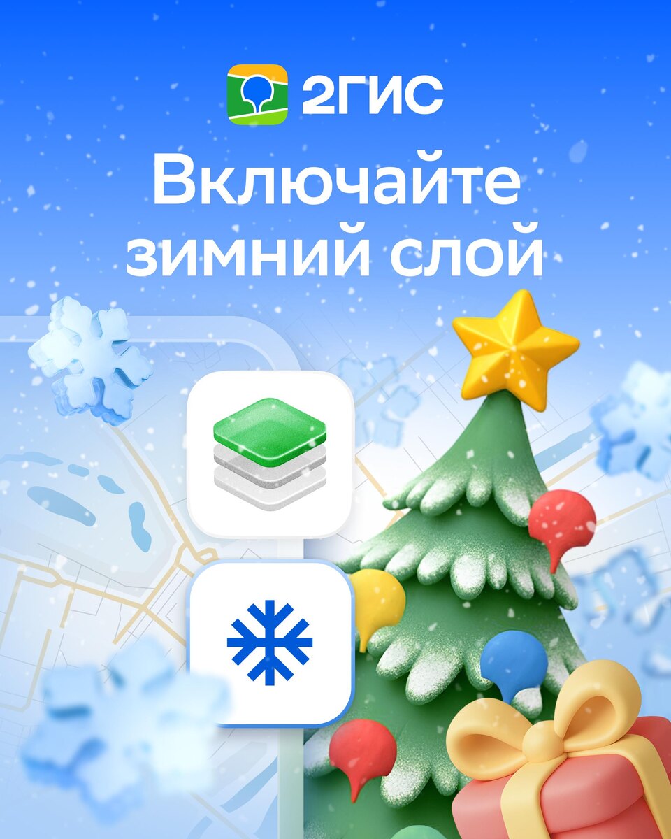 🎄 Просто праздник какой-то! В 2ГИС включается зимний слой и карта меняется: появляется снег, подарки и снеговики с анимацией, загораются гирлянды, в городе вырастают ёлки. Это маленький способ поймать новогоднее настроение, даже если в делах и суете до него пока не дошли руки. Открываешь карту, и город выглядит чуть праздничнее, чуть теплее, чуть ближе к Новому году. Включайте снежинку в 2ГИС и посмотрите, как зима выглядит у вас на карте. А как у вас с настроением? 👍 — уже новогоднее ❤️ — ещё в пути