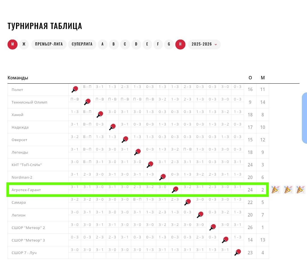 ! 15 декабря в Пензе завершился второй тур «Чемпионата Профессиональной лиги настольного тенниса» (сезон 2025/2026) среди мужских команд Высшей лиги Н. Наша команда под капитанством Алексея Мяснянкина показала отличный результат: 6 побед; 1 поражение; 2‑е место в турнирной таблице по итогам тура. Гордимся ребятами и ждём новых побед! 💪 Присоединяйтесь к нам в VK, Дзен, Rutube, @gvarta36 в запретограмм