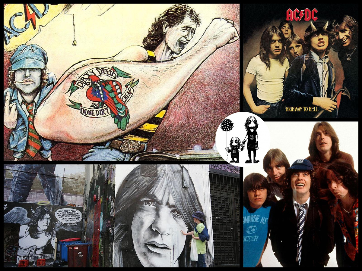 Австралийская обложка альбома Dirty Deeds Done Dirt Cheap, на которой Ангус Янг показывает «козу», а Бон Скотт — мускулистую руку, почти как у моряка Попая. Она была создана студией Kettle Art Productions.