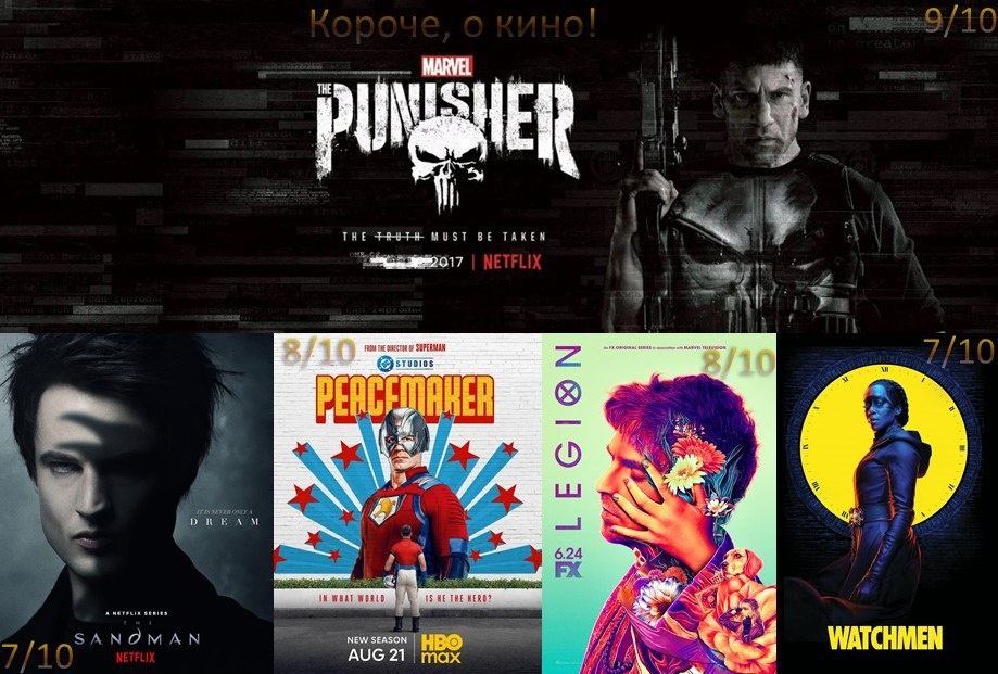 1. Каратель/The Punisher 2017–2019 Моя оценка: 9 из 10 Рейтинг на Кинопоиске/IMDb: 7.8 / 8.4 Ветеран превращает личную войну в методичную чистку преступного подполья. 2. Легион/Legion 2017–2019 Моя оценка: 8 из 10 Рейтинг на Кинопоиске/IMDb: 7.4 / 8.1 Психоделический эксперимент: реальность дробится, а протагонист пытается понять, кому принадлежит его собственный разум. 3. Миротворец/Peacemaker 2022–… Моя оценка: 8 из 10 Рейтинг на Кинопоиске/IMDb: 8.0 / 8.3 Абсурдный, громкий и неожиданно человечный сериал о человеке, который стремится к миру любой ценой. 4. Хранители/Watchmen 2019 Моя оценка: 7 из 10 Рейтинг на Кинопоиске/IMDb: 7.0 / 8.2 Альтернативная история, моральные расколы и циничная деконструкция масок. 5. Песочный человек/The Sandman 2022–2025 Моя оценка: 7 из 10 Рейтинг на Кинопоиске/IMDb: 7.1 / 7.6 Готическая фантазия про короля Снов: поэтичная, мрачная и разнообразная по тонам история о власти над человеческими желаниями и страхами. Ещё подборка по комиксам: Нестандар