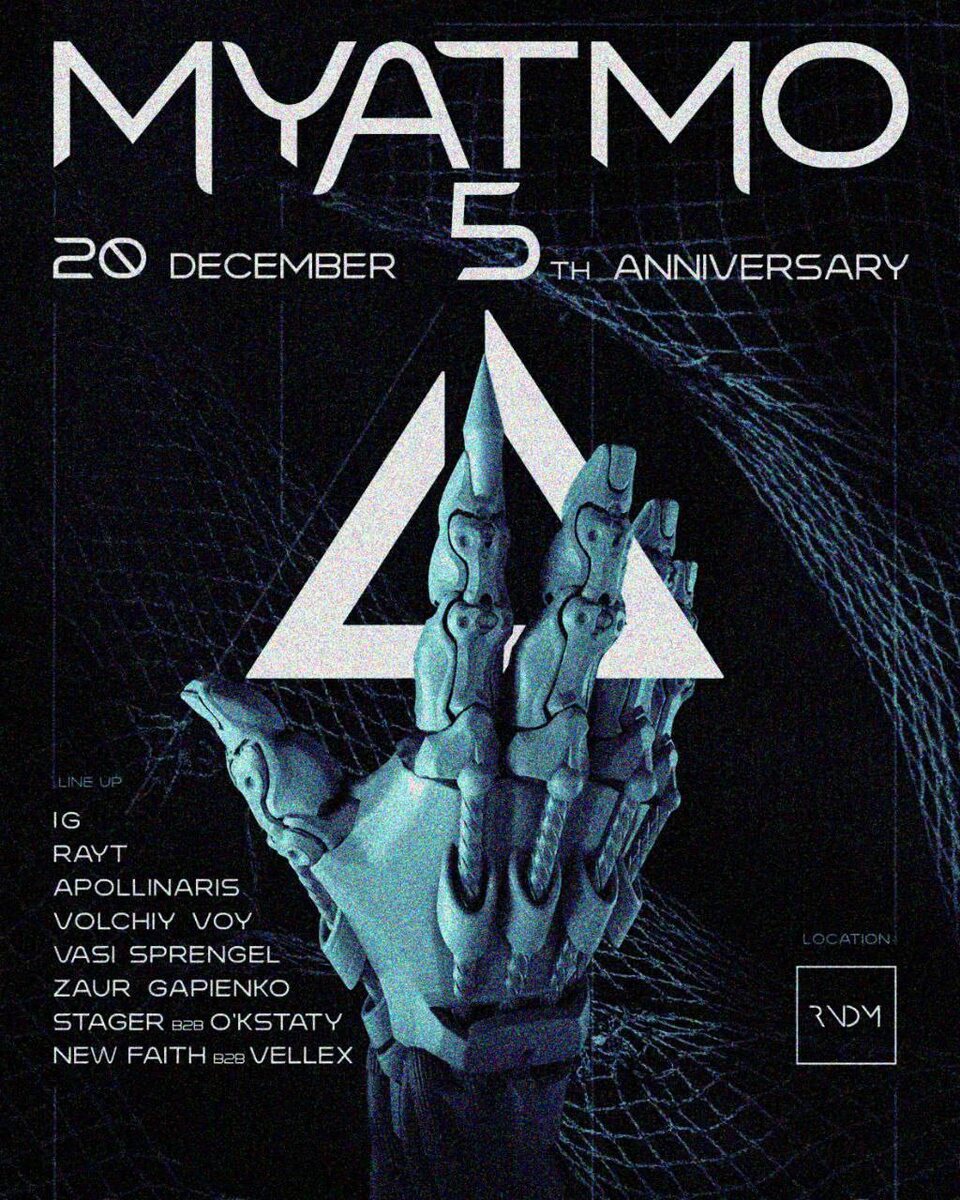 Пять лет мы идем, создавая звук там, где его никогда не ждали. Формируем взгляды, теряем все и обретаем еще больше. Это срок, когда ВСЕМ нашим резидентам есть, что сказать. MYATMO объединит этой ночью зов на луну от Volchiy Voy, собственный фирменный стиль и характер каждого нашего резидента, а также шипованные великолепие и нежность APOLLINARIS . Line up: - IG - RAYT - APOLLINARIS (FEMME FATALE) - VOLCHIY VOY (Dekadance / Synestesia) - Vasi Sprengel - Zaur Gapienko - Stager b2b O’Kstaty - New Faith b2b Vellex 🎫 Билеты 📆 20 декабря, в 23:00 📍 RNDM, Москва, Наставнический пер., 13/15с3