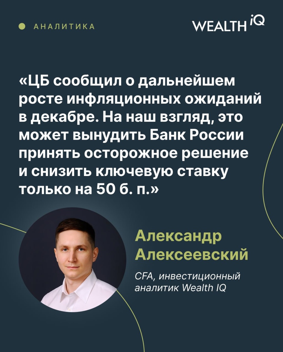 ? 💬 Александр Алексеевский, CFA, инвестиционный аналитик Wealth IQ Скорее всего, ЦБ предметно будет обсуждать два варианта: снижение ключевой ставки на 50 или 100 б. п. (до 16% и 15,5% соответственно). До вчерашних цифр по инфляционным ожиданиям населения мы были настроены более агрессивно и склонялись к варианту со снижением ставки на 100 б. п. Тем не менее ЦБ сообщил о дальнейшем росте инфляционных ожиданий в декабре. На наш взгляд, это может вынудить Банк России принять осторожное решение и снизить ключевую ставку только на 50 б. п. в преддверии повышения НДС. Почему мы ждем снижения ставки? Ключевой фактор — замедление инфляции. Согласно оценке Банка России, в ноябре инфляция с устранением сезонности и в пересчете на год (SAAR) снизилась до 2,2% с 7,0% месяцем ранее. Базовая SAAR-инфляция, которая не учитывает волатильные компоненты, тоже замедлилась, но менее значительно — до 3,6% с 4,9% в октябре. Первые недельные данные декабря также пока указывают на то, что инфляция ост