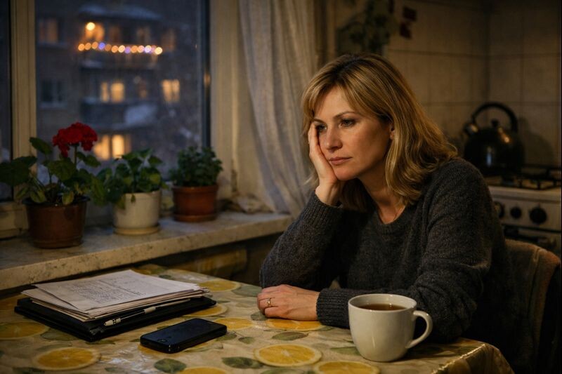 На кухне — скол на столешнице, прикрытый клеёнкой с лимонами. На подоконнике — три цветка, пережившие и переезд, и один не самый удачный брак. В телефоне — десятки непрочитанных сообщений в родительском чате и пара грустных мемов от подруги.