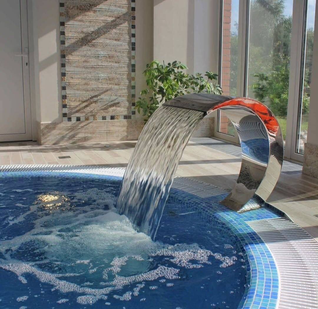 Работы включали в себя разработку проекта, заливку бетонной чаши, монтаж оборудования, гидроизоляция и отделочные работы. Как самого бассейна, так и и помещения вокруг бассейна. Аттракционы: гидромассаж, водопад. Изготовление монолитной чаши бассейна неправильной формы – достаточно сложный процесс. Бассейн переливной по всему периметру, с опорной консолью для опоры плиты перекрытия пола и переменной глубины. Вся чаша бассейна – единая монолитная конструкция без холодных швов.