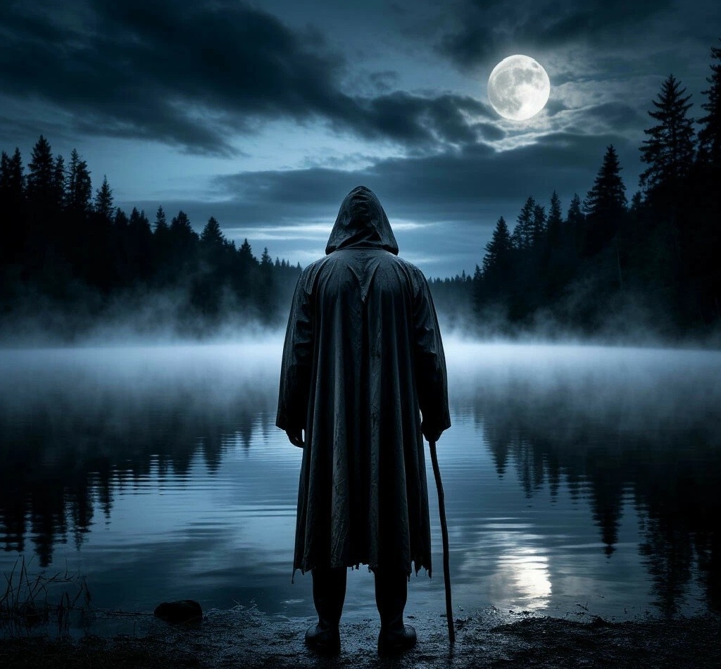 В поисках дров мы обошли периметр изрядный, но никого, надо сказать, так и не увидели. Странно, кто ж тут разговаривал? Напившись чаю, пожевав бутербродов, мы устроились в палатке и оставили Кузю дежурить в спальнике у костра. Среди ночи он ворвался в палатку с бешеными глазами и стал нас звать наружу. Мы вылезли, чертыхаясь. В нескольких метрах от нашей стоянки увидели странного мужика: в длинном брезентовом плаще, кажется, с лыжной палкой в руках, а лицо из-под капюшона кажется просто черным пятном -словно заштриховано карандашом. У меня заныло в животе было почему-то очень страшно. Не знаю, как описать ошущение — казалось, вот он сейчас подойдет и проткнет нас этой своей палкой, Но он стоял и не шевелился. Кузя тихо сказал.