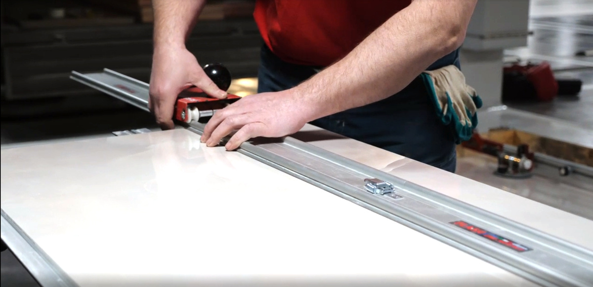 2. Резка керамогранита под углом 45 градусов для изготовления столешницы.
