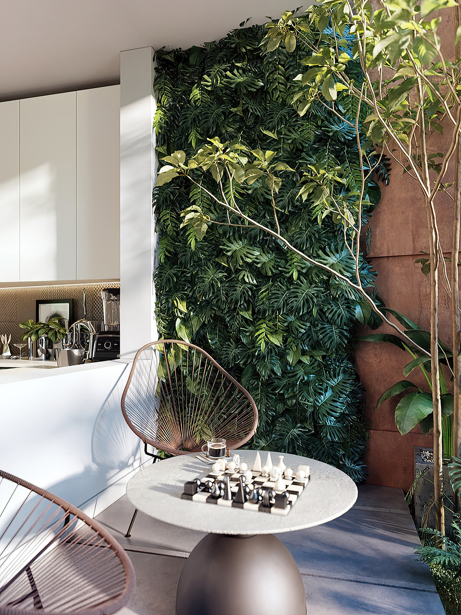 Вертикальные сады служат эффектным элементом декора. Они привносят цвет, текстуру и живость, что делает интерьер более интересным и уютным. Зелёные стены могут варьироваться от простых настенных конструкций до сложных художественн