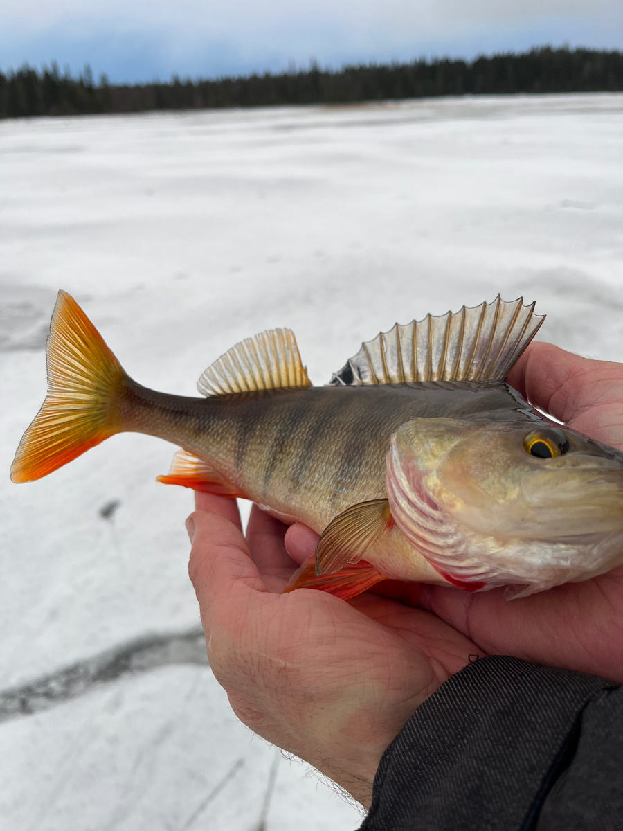первая лунка дает результат на 10 штук окуня. Активная рыбка. Тут нужна скорость. У меня проблема со снятием тройника из недр рыбы. Вожусь долго. Меняю блесну на впайку, пока меняла рыбка естественно разбежалась. Пару минут и она опять собралась под лункой.
