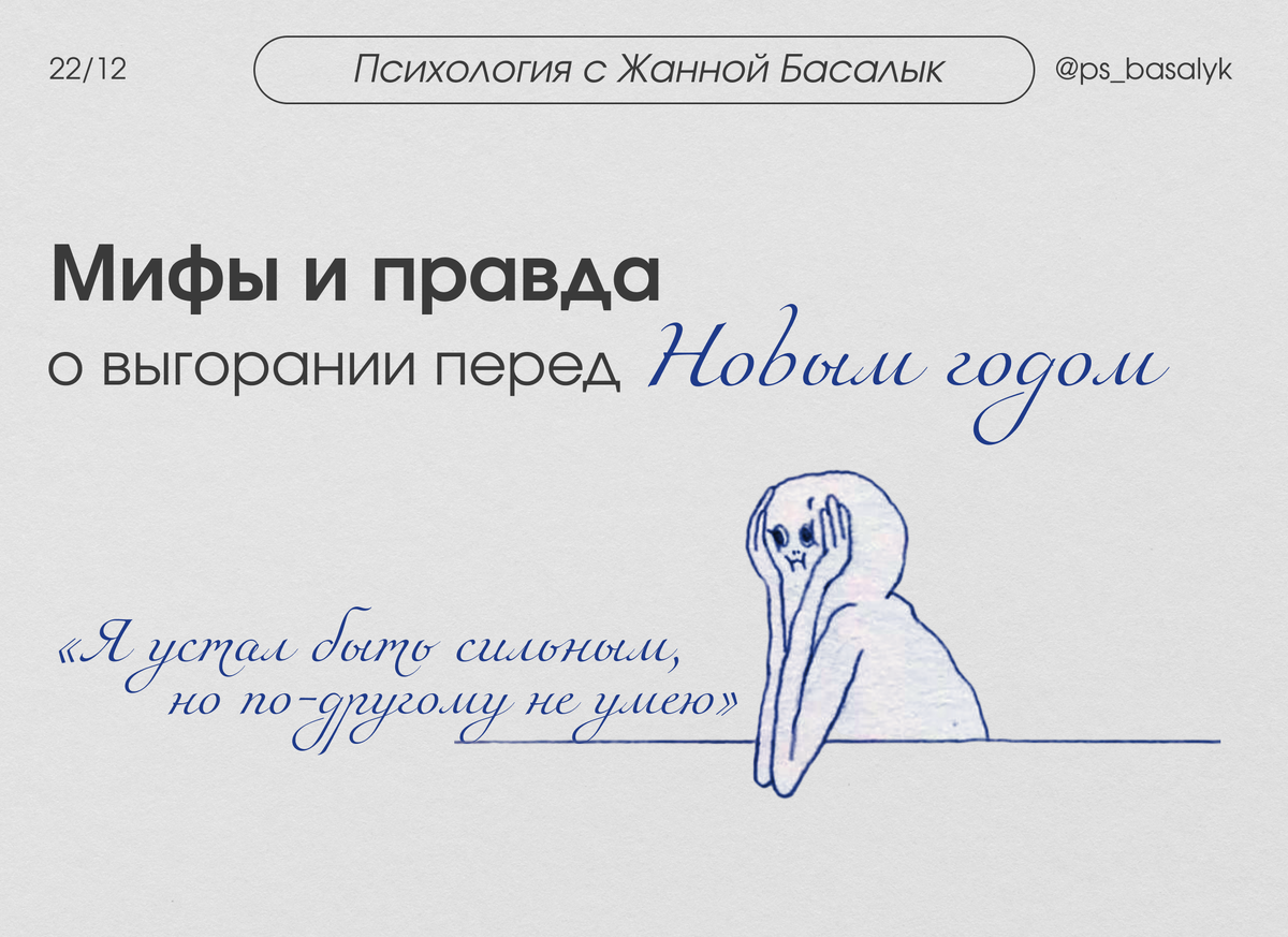 Если вы читаете это с мыслью: «Да, я держусь. Всегда. Но уже не могу» — этот пост для вас. Формат — МИФ / ПРАВДА, чтобы вы узнали себя. Правда: выгорают именно сильные. Те, кто: С точки зрения психологии постоянная «собранность» — это хроническое напряжение нервной системы, а не ресурс. Сила без восстановления превращается в истощение. Правда: это не факт, а внутренняя установка, сформированная опытом. Часто за ней стоит прошлое: Мозг делает вывод: «Контроль = выживание» Но в мирное время этот механизм начинает разрушать изнутри. Правда: если вы входите в Новый год выжатым — праздники навряд ли помогут. Потому что: Ощущение «я устал быть сильным» — это не про декабрь, а про длительное игнорирование своих пределов. Правда: терпение — не бесконечный ресурс. Психика может долго работать в режиме «держусь», но потом выключается: Это и есть выгорание, а не лень и не слабость. И Новый год — не момент собраться, а момент перестать требовать от себя невозможного, разрешить себе больше не быть