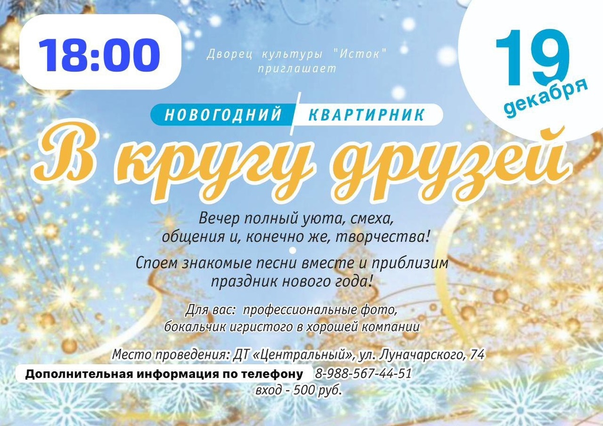 Здесь мы соберем друзей и близких, чтобы провести уютные часы в теплой атмосфере. 🎁 Вместе встретим Новый год — насладимся знакомыми песнями, зарядимся добрыми шутками и позитивом. 🤗 Музыка и смех согреют даже самые холодные вечера. 💫 С собой прихватите хорошее настроение — оно обязательно вернется к вам вдвойне 😊 Ведь радость заразительна, а в компании близких людей она множится в геометрической прогрессии! 🔍В ДТ Центральный 🚫 Возраст: 16+ 📆 19.12.2025 🕒 18:00 🏢 Парк им.Олега Степанова 📍 г. Серпухов, ул. Луначарского, д.74 💰 Цена: 500 ₽ ⭐Поддержать канал голосом 💰 Канал Вакансии Серпухова ✅ Мероприятия Серпухов https://dzen.ru/id/66f01c6eb4c6fe60c9ca1608 http://vk.com/serpukhov_events http://dzen.ru/serpukhov_events