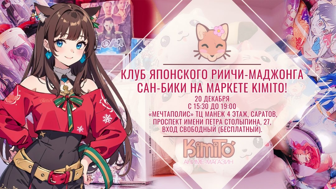 !🐟 Приглашаем всех гостей ярмарки поучаствовать в мастер-классе по традиционной японской настольной игре —риичи маджонгу! На мастер-классе вы научитесь базовым правилам игры и сыграете свою первую партию. Цель игры - собрать выигрышную комбинацию раньше соперников, используя набор из 136 фишек (тайлов), разделённых на масти. Вам предстоит испытать своё везение в соревновании против трех соперников одновременно! Когда: 20 декабря, с 15:30 до 19:00 Где: Развлекательный центр «Мечтаполис» ТЦ Манеж 4 этаж, Саратов, проспект имени Петра Столыпина, 27, Вход свободный! (да-да, бесплатно!)