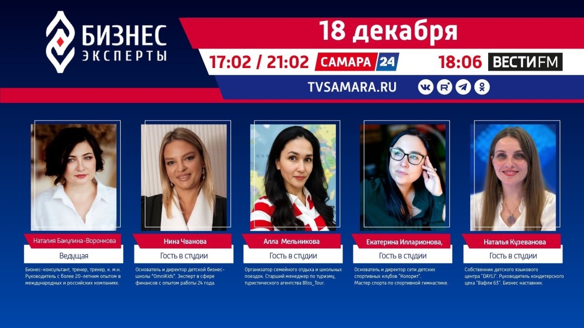 Как всесторонне развивать детей и организовать незабываемый семейный отдых? Вдохновляющие истории и советы для начинающих предпринимателей – расскажем в новом выпуске программы «Бизнес-эксперты». Гости программы: • НИНА ЧВАНОВА, основатель и директор детской бизнес-школы «OmniKids», эксперт в сфере финансов с опытом работы 24 года; • АЛЛА МЕЛЬНИКОВА, организатор семейного отдыха и школьных поездок, старший менеджер по туризму туристического агентства «Bliss_Tour»; • ЕКАТЕРИНА ИЛЛАРИОНОВА, основатель и директор сети детских спортивных клубов «Колорит», мастер спорта по спортивной гимнастике; • НАТАЛЬЯ КУЗЕВАНОВА, собственник детского языкового центра «DAYLI», руководитель кондитерского цеха «Вафли 63», бизнес-наставник. Ведущая: • Наталия Бакулина-Воронкова, бизнес-консультант, тренер, трекер, к. м.н., руководитель с более 20-летним опытом в международных и российских компаниях. Смотрите и слушайте выпуск программы сегодня, 18 декабря, в 17:02 и 21:02 – в эфире «Самара-24», а та