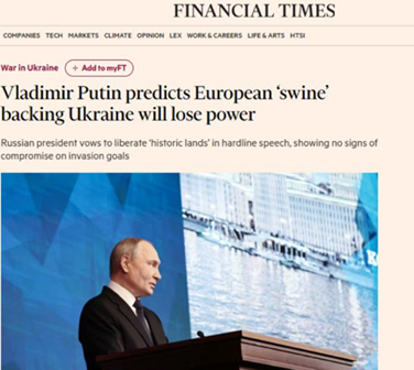 У нас есть блестящая возможность наблюдать в режиме реального времени, как формируется русофобия ни разу не лживыми забугорными либеральными сми. Сначала цитата Путина: «Европейские подсвинки тут же включились в работу администрации Байдена в надежде поживиться на развале нашей страны, вернуть себе то, что было утрачено в прежние исторические периоды, и попытаться взять реванш». А вот, что прочтут в заголовке Файнэншл Таймс обыватели, которых готовят воевать против России: «Владимир Путин прогнозирует, что европейские 'свиньи', поддерживающие Украину, потеряют власть». Слово «свиньи» поставлено в кавычки, чтобы подчеркнуть, что это прямая цитата Путина. Ну, убогие жЕ…