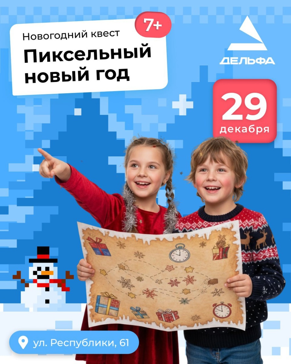 ? В этом году Новый год оказался под угрозой – Хакер-Ёлка запустил вирус на новогодний сервер и спрятал подарки в «скрытых буферах». Только самые смелые смогут восстановить праздник! Что ждёт ребят? — Захватывающий сюжет с полным погружением в пиксельный мир — Командные мини-испытания и головоломки — Сладкий подарок каждому участнику — Мастер-класс по термомозаике – создадим свои праздничные шедевры 💾 29 декабря, время на выбор Расписание ⬇️ 🟢10:00 – 11:00 🟢11:30 – 12:30 🟢13:00 – 14:00 ✏️ ул. Республики, 61 🌟 Стоимость: 1000₽ Жмите 👉 ЗАПИСАТЬСЯ ⬅️ и присоединяйтесь к новогоднему приключению! Не дайте вирусу испортить праздник – станьте частью настоящего новогоднего приключения!