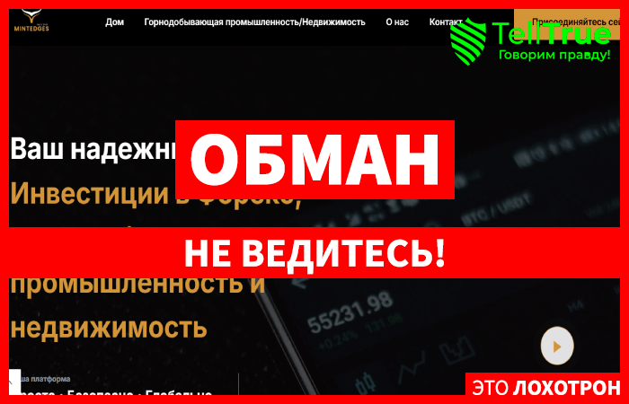 И снова мошенники пытаются презентовать себя, как надежную и проверенную компанию, заявляя на официальном сайте «Ваш надежный портал к Инвестиции в Форекс, горнодобывающую промышленность и недвижимость». Мошенническая компания MintEdges (mintedges.com) выдает себя за престижного и проверенного брокера, рассказывая о своих колоссальных перспективах, а по факту перед нами типичные мошенники и, они активно обманывают простых людей, не имея и минимального намеренья выплачивать средства. Так что пользователям стоит быть осторожнее. Полный обзор: https://telltrue.net/eto-lohotron/mintedges/