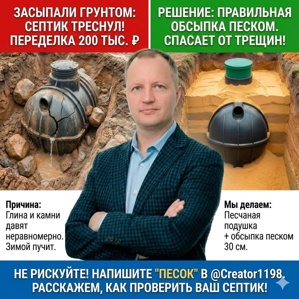 Через год он треснул. Переделка: 200 тыс ₽. История из Сысерти: Хозяин поставил септик Топас за 250 тыс ₽. Монтажники сделали «как обычно»: – выкопали котлован – поставили септик – засыпали грунтом из ямы (глина + камни) Через год: – корпус треснул – стоки начали вытекать в грунт – септик перестал работать ПРИЧИНА: Грунт от котлована (глина, камни) давит на корпус неравномерно. В таком грунте образуются пустоты, в которые устремляется вода. Зимой вода превращается в лед, грунт расширяется. Происходит эффект морозного пучения. Пластиковый корпус не выдерживает — трескается. Правильно: засыпать песком. Песок не пучит, распределяет нагрузку равномерно. РЕШЕНИЕ: Мы обязательно делаем: ✅ Песчаную подушку на дне котлована (20 см) ✅ Обсыпку септика песком со всех сторон (30 см) ✅ Послойное уплотнение с проливом водой ✅ Только сверху — грунт Это +15–20 тыс ₽ к стоимости. Но спасает от трещин и переделки за 200 тыс ₽. Напишите «песок» в Telegram: @Creator1198 Если у вас септик засыпа