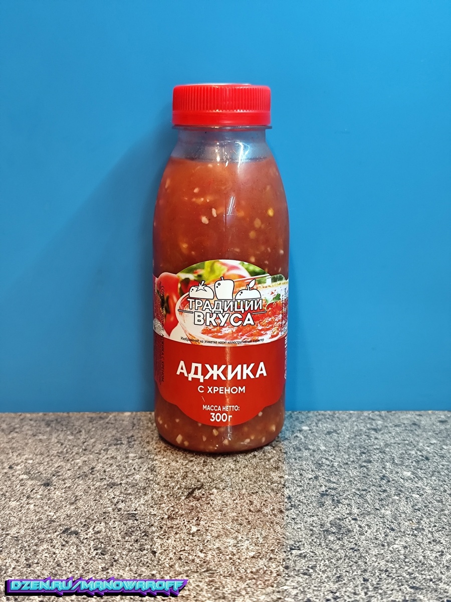 Так странно назвало свой соус ООО "Традиции вкуса". Ведь невооруженным глазом видно, что это совершенно не аджика, а хренодер. Впрочем, знаю я некоторых домохозяек, называющих аджикой такое самопальное хрючево, что джигиты на Кавказе икать начинают. Ладно, не будем придираться, а будем пробовать. Для начала посмотрим, из чего состоит данная "аджика": Ну вылитый хренодер же (вот только чеснока не хватает), а никакая не аджика. И с виду тоже. Пахнет хреном и слегка уксусом. Вкус кисловатый, помидорный, с привкусом хрена. В послевкусии легкая остринка. В общем, точно хренодер, только без чеснока и с небольшой остротой. С мясными продуктами идет хорошечно. В "Дикси" стоит 90 рублей за 300 грамм.