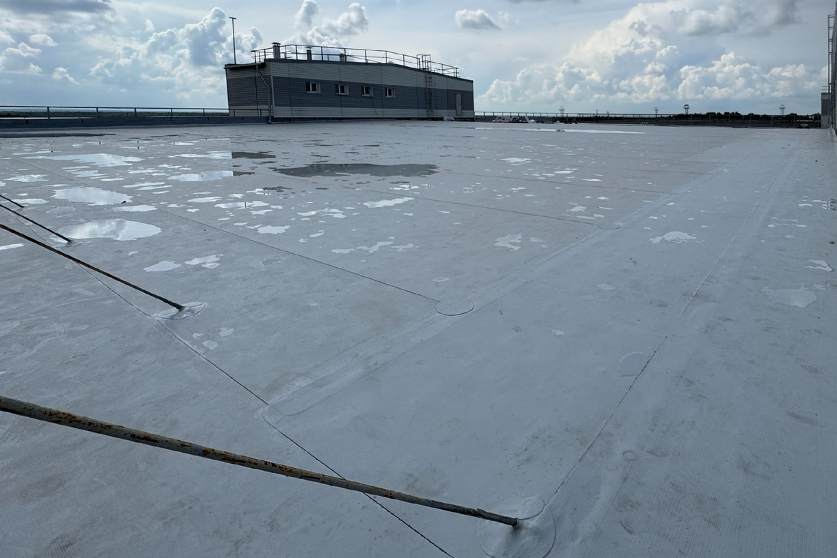 . А теперь — первый объект, где она реально сработала. Инженерный разбор: мембранная кровля на складе Объект — плоская эксплуатируемая кровля складского здания. Недавно здесь уже выполняли гидроизоляцию, но после первых дождей кровля потекла. Заказчик обратился к нам, чтобы разобраться в причине и подобрать решение, которое действительно сработает. Осмотр показал: проблемы — в стыках и нарушении герметичности покрытия. При таких площадях и нагрузках любые недочёты быстро дают о себе знать. Мы предложили технологию мембранной кровли — как вариант, где ключевое преимущество именно в надёжности соединений и устойчивости к стоячей воде. Сейчас система полностью смонтирована, кровля прошла проверку на герметичность. Дальше — наблюдаем, как материал поведёт себя в эксплуатации.