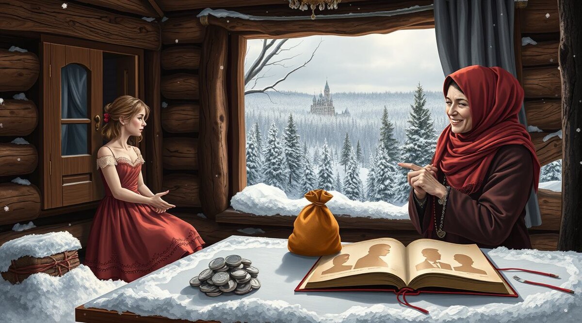 Жила-была в большом снежном городе красна-девица Аннушка, что мечтала о суженом-ряженом, как в старых русских сказках. Под Новый год, когда елки сверкают, а сердца полны надежд на чудо, пошла она к знаменитой Свахе – той самой, что слыла волшебницей в делах сердечных. "Найду тебе принца на белом коне!" – пообещала Сваха, сверкнув глазами. Услуги ее стоили недешево – 150 серебряных монет! Но хитрая Сваха шепнула: "Возьми взаймы у моего братца, он богат!" Аннушка, околдованная новогодней магией, пошла и взяла нужную сумму у брата Свахи, и ждала счастья. По тому волшебному свитку Сваха клялась: нарисует портрет души Аннушки, запрячет его в тайную книгу женихов со всего света, проведет урок чародейского обаяния и подберет не меньше пяти добрых молодцев – из тех краев, что желает девица, и по сердцу подходящих. Но ой, не тут-то было! Чары Свахи оказались с подвохом: портрет, не показав запрятала, а женихов прислала какие попались. Трое – из дальних царств-государств, не из тех краев, что пр