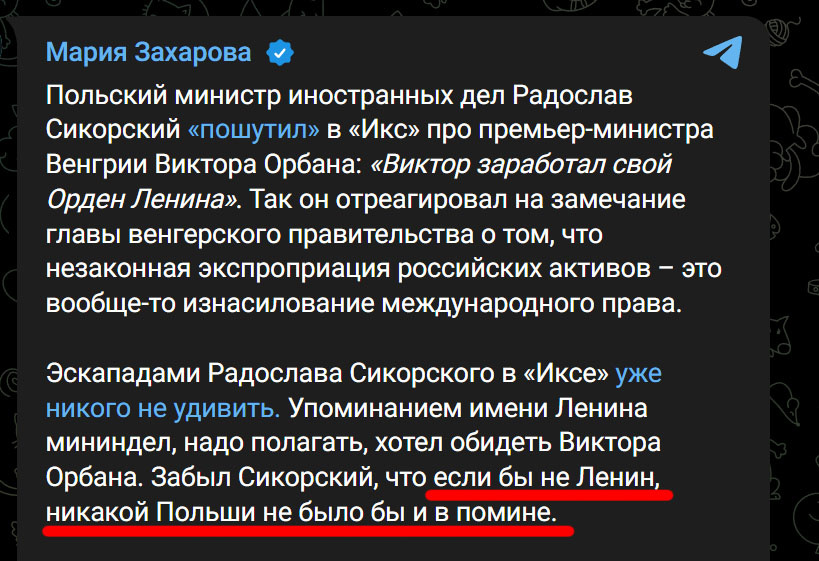 Начальство продолжает совершать удивительные исторические "открытия" в удобном для себя ракурсе. Так госпожа Захарова заявила недавно о ключевой роли Ленина в создании Польши, как независимого государства: Вообще-то, вопрос о независимости Польши был решен задолго до прихода к власти в России большевиков во главе с Лениным. Сперва к ее независимости приложили руки Германия с Австрией, издавшие 5 ноября 1916 года манифест о создании самостоятельного польского государства, включая территории Привислинского края, входившего в состав Российской империи. В ответ на это Николай Второй в декабре 1916 года был вынужден объявить о создании свободной и единой Польши на условиях союза с Российской империей в борьбе против Германии и Австрии. Однако Российская империя перестала существовать в феврале-марте 1917 года и уже Временное правительство Российской республики заявило о поддержке поляков в их стремлении создать независимую Польшу: Временное Правительство считает создание независимого польск