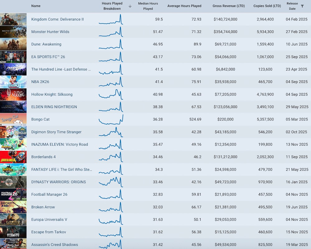 Забавно, что главный конкурент этой игры на TGA, который в итоге выиграл с триумфом всё, что можно, в этом списке вообще не фигурирует, что косвенно намекает на то, что у Clair Obscur: Expedition 33 все-таки был большой процент игроков, забросивших игру на ранних этапах. А вот Kingdom Come: Deliverance II стала самой играбельной новинкой 2025 года, в которую каждый купивший её игра наиграл как минимум почти 60 часов.
