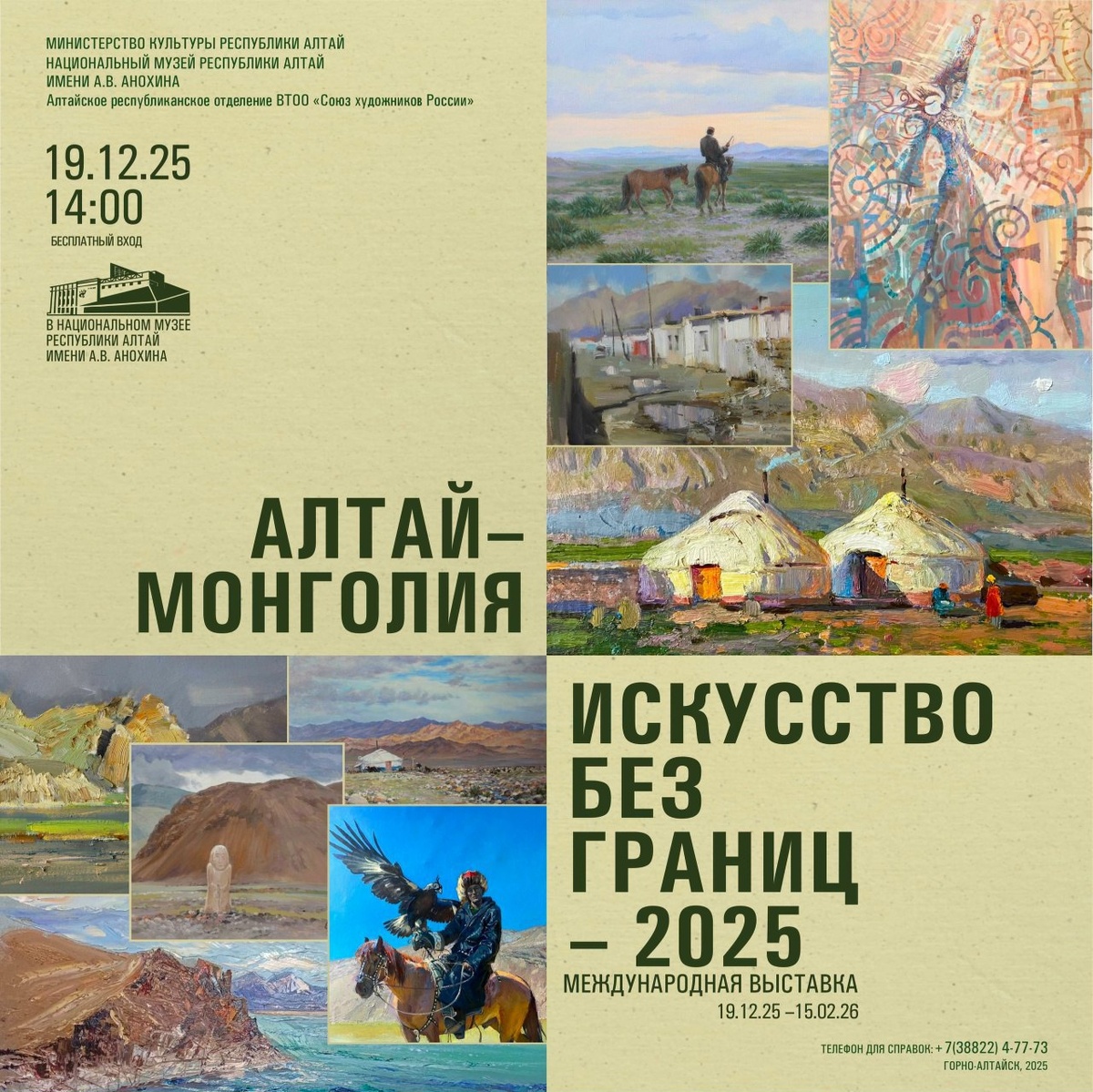 Искусство без границ – 2025» 19 декабря в 14:00 в Национальном музее имени А.В. Анохина состоится открытие значимого культурного события — итоговой выставки международного проекта «Алтай-Монголия». В экспозиции будут представлены работы, созданные в ходе совместного пленэра художников из России и Монголии. В творческой экспедиции в Монголии приняли участие живописцы и графики из Республики Алтай, Алтайского края, Новосибирска, Новокузнецка и Москвы. Проект был организован Союзом художников Республики Алтай при поддержке Правительства Республики Алтай и Администрации Баян-Ульгийского аймака Монголии. Выставка завершает сезон 2025 года и знаменует собой продолжение многолетнего культурного обмена. С 2010 года художники из Республики Алтай, среди которых Ерболат Нуриманов, Алексей Эдоков, Владимир Ельников, Елена Корчуганова и другие, регулярно проводят пленэры в монгольском городе Баян-Ульгий, а также организуют совместные выставки в обеих странах. Инф. Национальный музей