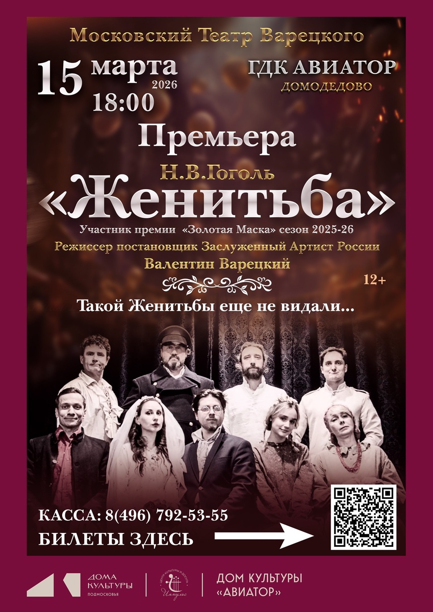 ✨ СПЕКТАКЛЬ «ЖЕНИТЬБА» ✨Московский Театр Варецкого представляет новаторский подход к извечному вопросу: Жениться или не жениться? ✨Где Правда?! Так или этак? Герои комедии Николая Васильевича Гоголя, ярки на любой вкус, обитают в разных слоях перемен Судьбы, каждый мечтает о вечном счастье. Найдут ли!? Надворный советник Иван Кузьмич Подколесин, уже не слишком юн и в конце концов решает Жениться. ✨Нанятая Сваха уже вовсю хлопочет, портной вовсю шьет фрак для свадьбы, и вроде найдена невеста подходящая. Но последний шаг, как известно, бывает труднее первого. 🚫 Возраст: 12+ 📆 15.03.2026🕒18:00 🏢 Городской дом культуры «Авиатор» 📍 г. Домодедово, ул.Гагарина, д.1 🎫 Купить билет: https://biletof.com/action/?frame=1&ra=17241 ✅ Мероприятия Домодедово https://dzen.ru/id/66f10385cc4c5a16f7b5fb02 http://vk.com/domodedovo_events http://dzen.ru/domodedovo_events