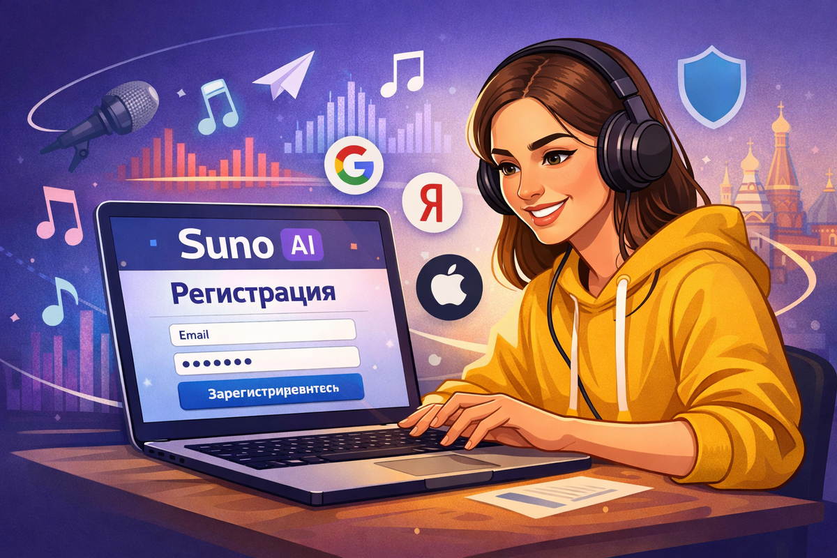Иногда Suno AI ограничивает регистрацию с российских IP. Решение простое — используйте ХХХ или выберите способ входа через сторонний сервис (Google, Discord).