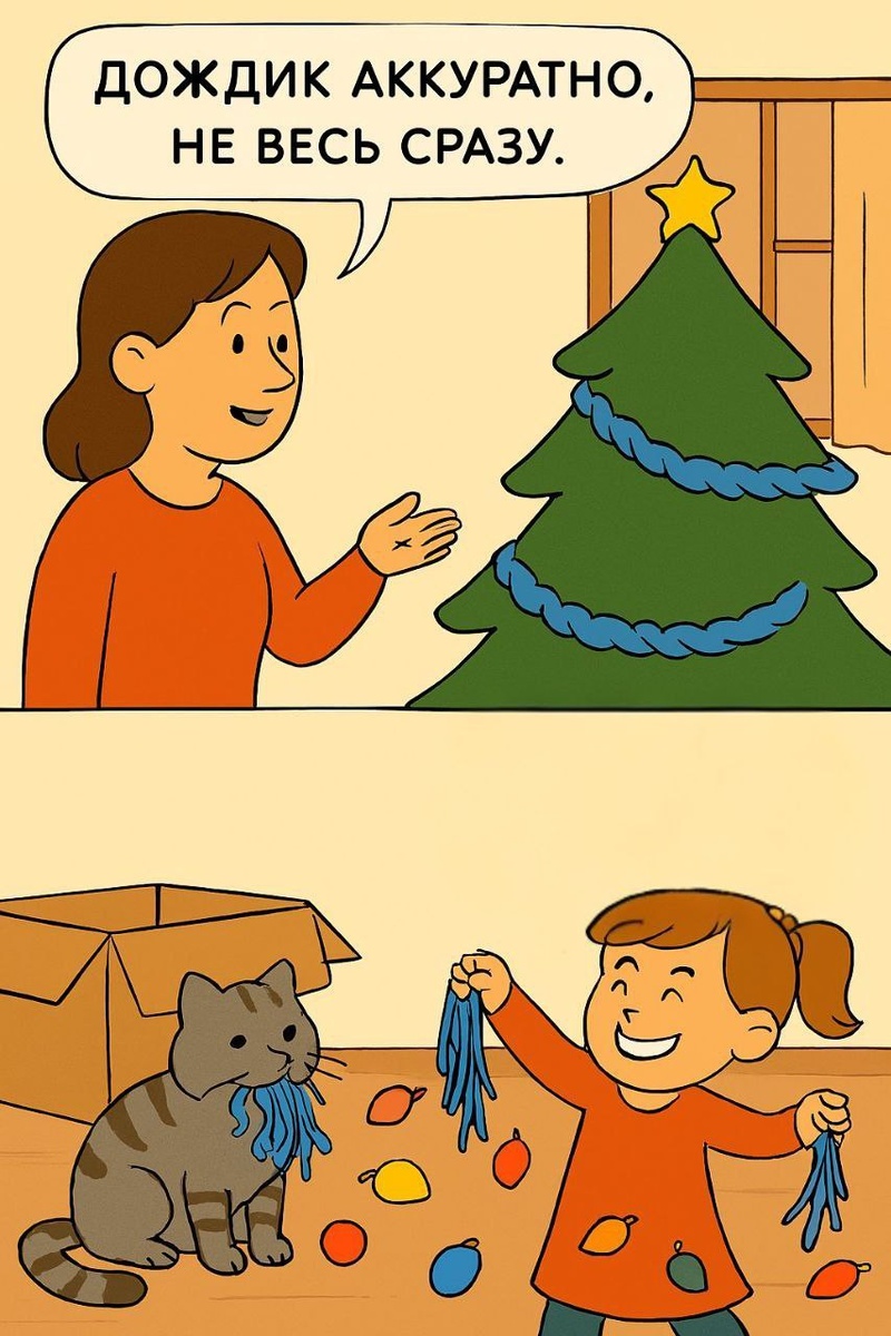 ✨ Что делаем сегодня Сначала украшаем дом - как получится. Гирлянды, свечи, огоньки, уют. Потом ставим и наряжаем ёлку: с детьми, котами, перекосами и бесконечным "я ещё одну повешу". Без переделывания "как надо". Пусть будет атмосферно и по-живому ❤️ 🎯 Задание Украсить дом и нарядить ёлку всей семьёй. ❄️ Вопрос Кто сегодня больше всего "помогал" с ёлкой - ребёнок или кот? 😄
