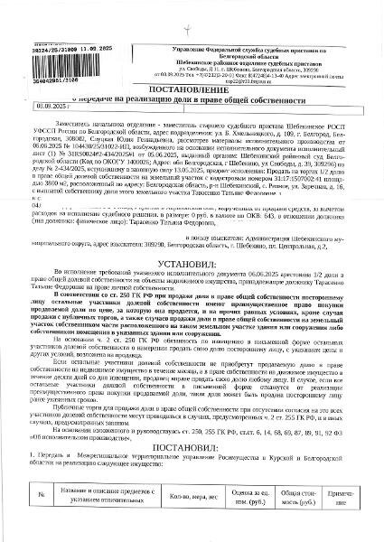 м., кадастровый номер 31:17:1507002:41. Имущество обременено: арест, запрещение регистрации. Имущество принадлежит на праве собственности Тарасенко Т.Ф. Основание реализации: постановление о передаче на реализацию доли в праве общей собственности от 08.09.2025 Шебекинское РОСП Канал: Госземля Белгородская область Область: обл Белгородская р-н Шебекинский Район: с. Репное Населенный пункт: ул. Заречная, д. 16 Локация: Смотреть на карте ВРИ: Ведение личного подсобного хозяйства на полевых участках Кадастровый номер: 31:17:1507002:41 Кадастровая стоимость: - Вид сделки: Продажа Площадь: - Начальная цена: 348500.00 руб. Дата завершения: 19.01.2026 Подробнее: ГИС ТОРГИ #госземля #земляотгосударства #земля #земельныйучасток #земельныеторги #торги #аукцион #продажаземли #продажа #белгородскаяобласть