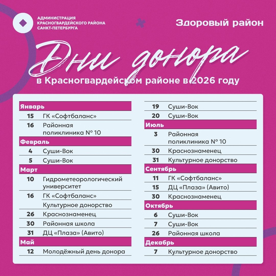 В 2025 году сдали кровь свыше 1400 человек, в следующем — запланировано 23 донорских дня Итоговой донорской акцией в районе стало «Культурное донорство». 17 декабря мероприятие впервые прошло в обновлённой библиотеке «Малоохтинская». Донорами стали 33 человека, 8 человек вошли в Федеральный регистр доноров костного мозга. Акцию поддержала ремесленная мастерская Pumpitu, которая работает в Красногвардейском районе. Специально для участников акции кондитеры изготовили конфеты ручной работы. В этом году свыше 1400 жителей района сдали кровь на мероприятиях в районе. Донорские дни прошли при поддержке выездных бригад Городской станции переливания крови. В 2026 году в Красногвардейском районе запланировано 23 донорских дня, которые пройдут в школах, поликлиниках, предприятиях и компаниях. Получит продолжение и «Культурное донорство» — 3 акции состоятся в современных библиотеках района. Ближайший день донора в новом году пройдёт 16 января в поликлинике №10 на Шаумяна, 51. Он будет посвящ