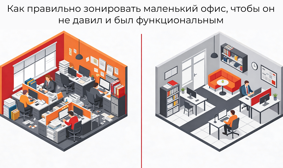 Проблема маленьких офисов не в размере, а в неправильном использовании пространства. Загроможденность, отсутствие четкого зонирования, неудачная расстановка мебели превращают компактное помещение в некомфортное. Люди начинают мешать друг другу, негде провести встречу, нет места для хранения документов.
