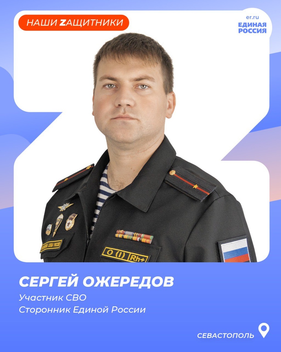 Активист «Единой России» Сергей Ожередов из Севастополя еще студентом стал активистом Молодой Гвардии Единой России, работал в студотряде. После срочной службы в армии подписал контракт с Минобороны. В 810-й Отдельной гвардейской бригаде морской пехоты прошел путь от матроса до младшего лейтенанта, командовал ротой. Принимал участие в военной операции в Сирии, в миротворческой операции в Нагорном