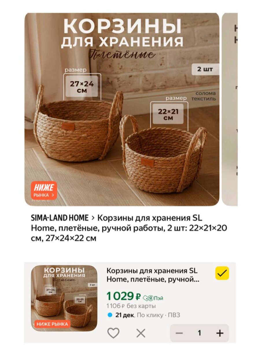 Корзины для хранения SL Home, плетёные, ручной работы, 2 шт: 22×21×20 см, 27×24×22 см https://market.yandex.ru/cc/8HShd9 🛍DEC122-AF — скидка 100 ₽ на один любой заказ от 5000 ₽ ✅ Канал по скидкам 🔣 Бот с промокодами