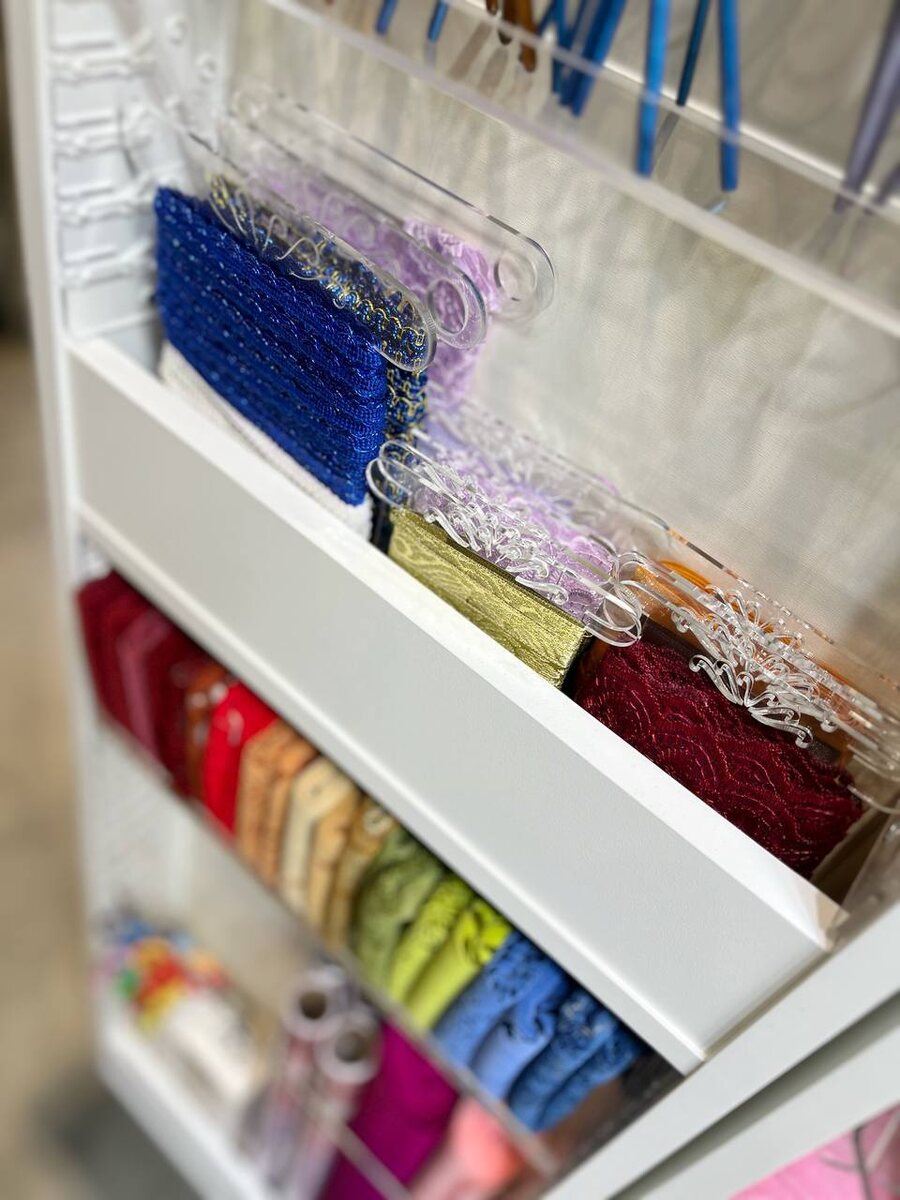 С бобинами из оргстекла хранение лент, кружева и тесьмы станет удобным